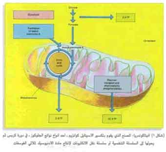 شكل رقم (1 ) الميتاكوندريا: المصنع الذي يقوم بتكسير الاسيتايل كوانزيم -أحد أنواع نواتج الجلوكوز- في دورة كربس ثم يحولها إلى السلسلة التنفسية أو سلسلة نقل الإلكترونات لإنتاج مادة الادنيوسيك ثلاثي الفوسفات