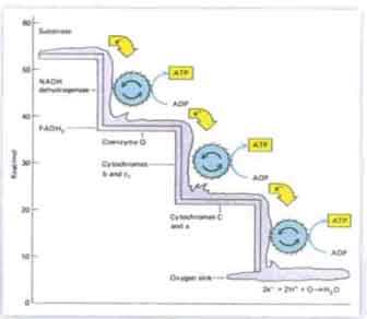 شكل رقم (3 ) يظهر الهيدروجينات المنتزعة من دورة كريس وانتقالها من مادة إلى أخرى في السلسلة التنفسية وانحدارها من مستوى طاقة عالية إلى مستوى أقل بحيث يستعمل فرن الطاقة في تحويل مادة الأدينوسين ثنائي الفوسفات إلى أدينوسين ثلاثي الفوسفات وفي النهاية اتحاد هيدروجينين مع أكسجين لتكوين جزئية ماء.