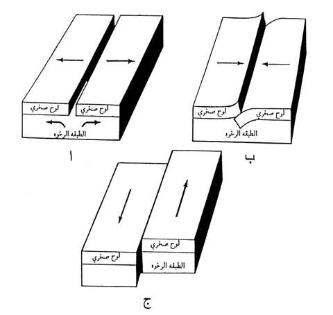 ) الزلزلة ( 1- 2 )وبناءً على نظرية الألواح التكتونية يمكن تقسيم حدود الصفائح طبقًا لحركة الصدوع واتجاهاتها، إلى ثلاثة أقسام رئيسية كما يلي ( شكل 2 ):