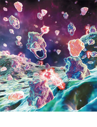 وهي القطع اللامعة الصغيرة ملتصقة بالخلايا السرطانية كبيرة الحجم لتدميرها.